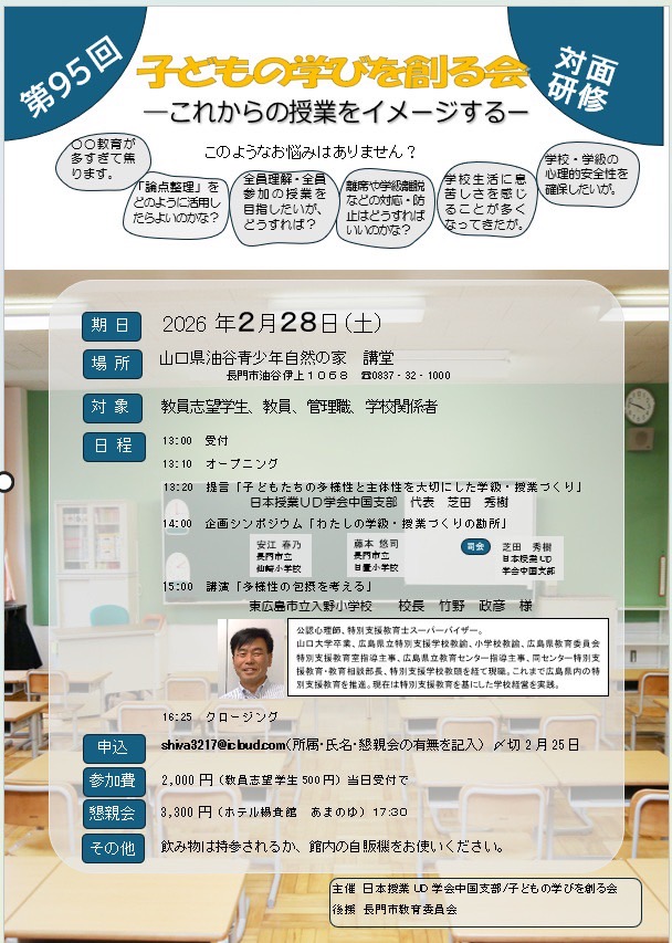 問合せ shiva3217@icloud.com(子どもの学びを創る会 /日本授業UD学会中国支部代表 芝田)