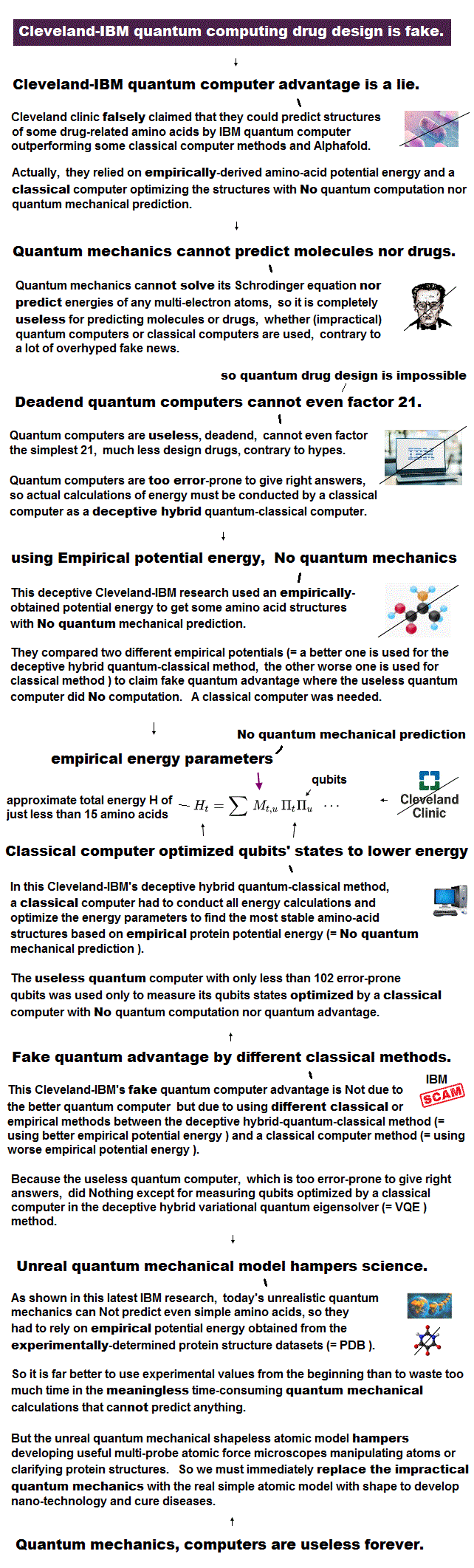 (Fig.1) Cleveland-IBM's deceptive hybrid computer relies on empirical protein potential energy and a classical computer optimizing energy with No quantum mechanical prediction nor quantum computation nor quantum advantage.