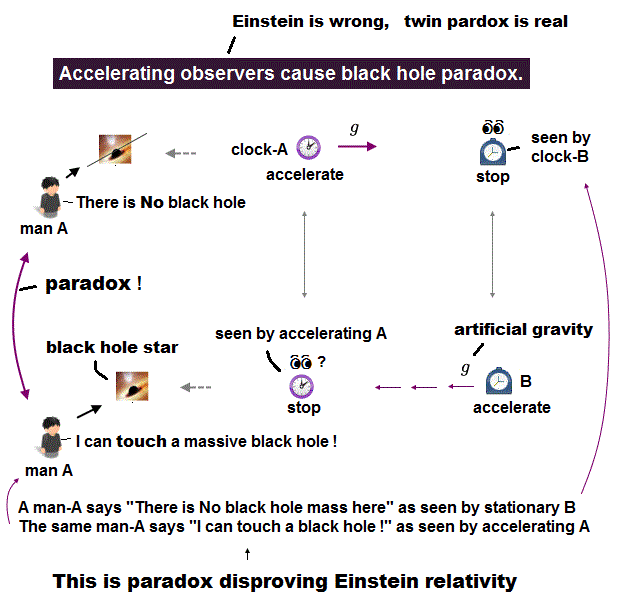 ↑ The same man-A (= existing in the place inside the artificial black hole = L > c2/g all the time since the past ) says (or takes a note of ) the different paradoxical things (= the same man-A says he can touch massive star = black hole or not ) as seen by different observers, which is clearly relativistic paradox disproving Einstein.