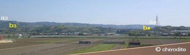 上下の写真ともに、白文字の a1〜a4 は阿武隈山地南部のスカイライン、阿武隈山地の手前にある黄色文字の b1〜b4 は、高位段丘等の乗る丘陵地のスカイライン