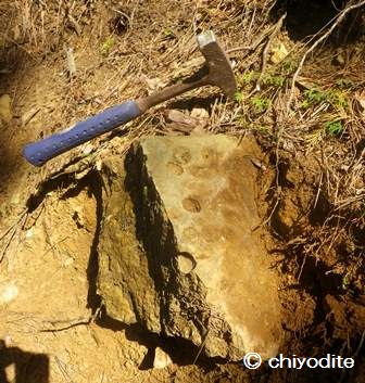 図7 尾根下の山道脇でみられた、カモメガイの化石穿孔痕多数を有する緑色片岩巨レキ. 一部破断。