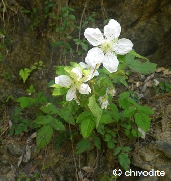 上図 林道脇に咲いていたキイチゴの5弁の白花(和名・学名不明)。キイチゴ:バラ科キイチゴ属の植物。