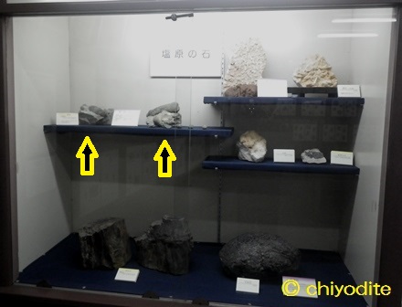 図4 「塩原5銘石」等の展示コーナー 黄色矢印の先が芋石の標本