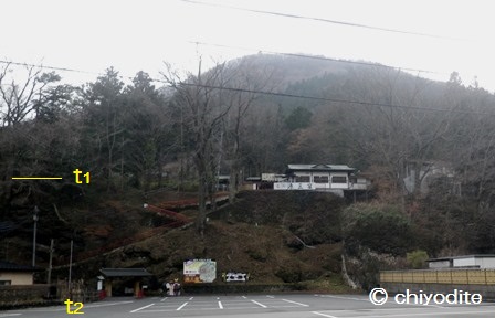 Fig.8 A signboard of Gen-zan-kutsu(left photo), Genzankutsu facilities on the upper terrace; "t1 "and parking lot on the lower terrace; "t2"(right photo)