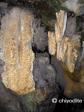 洞内にはこの洞窟のでき方の説明板(図11)があり、理解を助けてくれます。つらら石 stalactite (図13)や石筍(せきじゅん) stalagmite (図14)といった鍾乳石 speleothem がたくさん見られます。