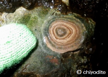 Fig.14 Crosscutting, polished stalagmite with my left index finger in the cave. This looks like the annual ring of wood. This surface tell us that these kind of rocks were constructed with the circular growth of minerals; impure calcite.