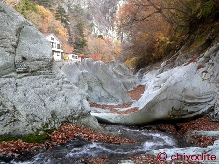 Photo above: Akasawa-onsen-ryokan, beside Hoki River in late autumn