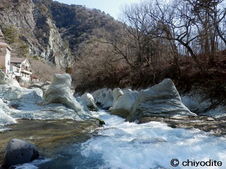 岩頭の左側には箒川の本流があって、大きな落差を川水が滝のようにゴウゴウと大きな音を立てて勢いよく流れています。いわゆるホワイトウオーター white water ですね。