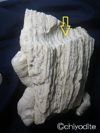 なお、黄色矢印は標本採集時に剥がれたであろう、石灰質棲管の痕跡、言いかえると穿孔痕の雄型を示します。