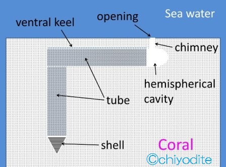 ムロガイは、ほぼ球形の居住する空間は作る ものの、イシカブラのような長い棲管は作らないようです。Massin, C.(1983)は少々移動した穿孔痕もあるとみています。サンゴの成長との関係は不明です。