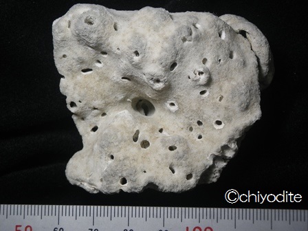 多くの標本は打ち上げられたサンゴ塊中から取り出されたものと思われ、半球状の空隙や煙突状突起を含むサンゴ部分はたぶん波によって破壊されて残っていないのでしょう。