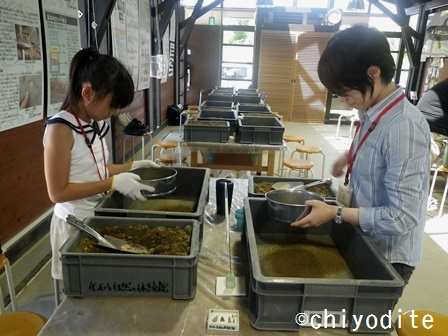 体験に使用する土砂は、「れき混じり、粘土質の土砂」"clayey sand with pebble"と表現できます。柔らかくて、ふるうには好都合なのですが、雨の日などは粘りけが強まるため、ふるいの 目詰まり the net clogged with wet muddy sand が起こり、やりにくくなります。.