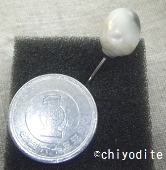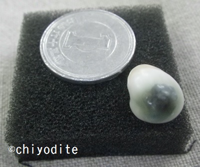 Fig.1 Natural pearl from a cultivated oyster from Ishinomaki City, Miyagi Prefecture. I was very lucky to get this one on my winter dinner. When I had some peeled oyster which was sold at a supermarket, my rightside molar clicked.