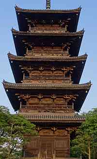 弘化元年(1844)頃完成。総高34.3m。本瓦葺。心柱は初重から立つ。四天柱を内側に仏壇を作り、五智如来を安置。三重までの材は欅を用い、四・五重は松材を主として用いると云う。