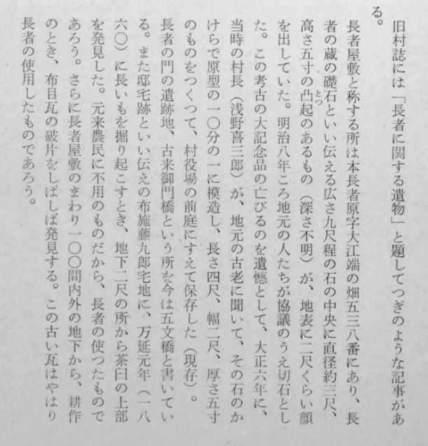 「長者が蔵の礎石と云伝はりたるものは古来長者屋敷とと称し今は本長者原字大江端の畑538番地の中にありて広9尺程の石の中央に直径約3尺、高さ5寸の凸起あり。地表2尺位露出し・・・・・・(中略)・・・・・。長者屋敷より四方百間内外の地には地下より田畑耕耘のとき布目瓦の破片を往々発見せらる。」