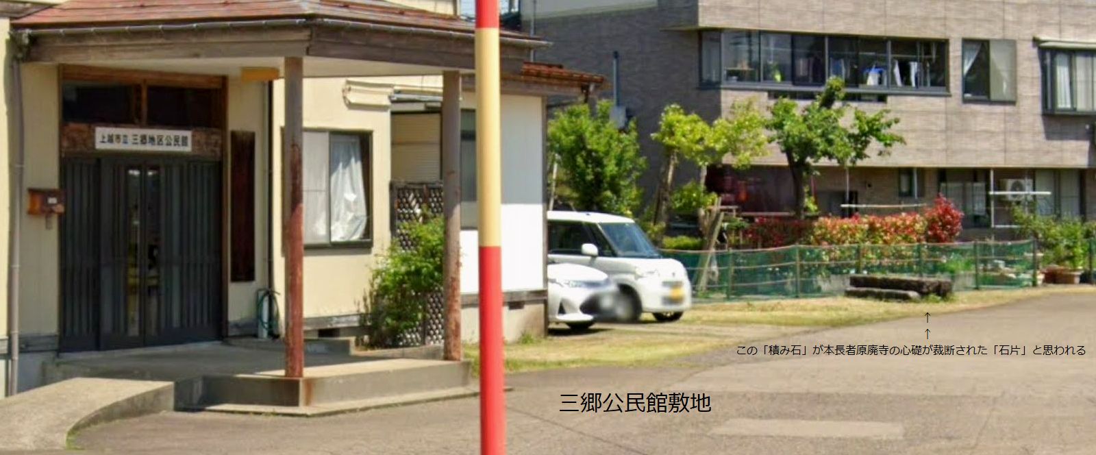 「乙宝寺心礎と頸城地方心礎の問題」で述べられる「大正6年当時の三郷村長がこれを惜しみ親しく古老に聞いて礎石の切片長さ4尺巾2尺厚5寸のものを使って当時の原形の約10分の1に縮小した1尺四方の礎石を造り、永久に保存することを計った。現在三郷公民館の前に置かれている。」との記述があり、これに符号する。