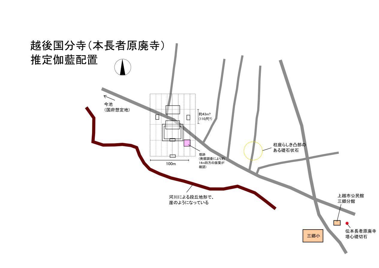 本長者原廃寺推定図の掲載があるので、転載する。 本長者原廃寺(越後国分寺)の推定伽藍配置図として妥当性のあるものと評価する。