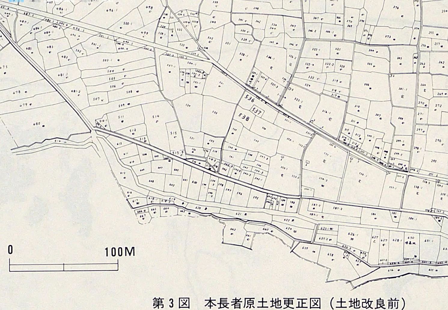 ○本長者原附近の地籍図:(圃場整理前):A地点でトレンチ、ここ