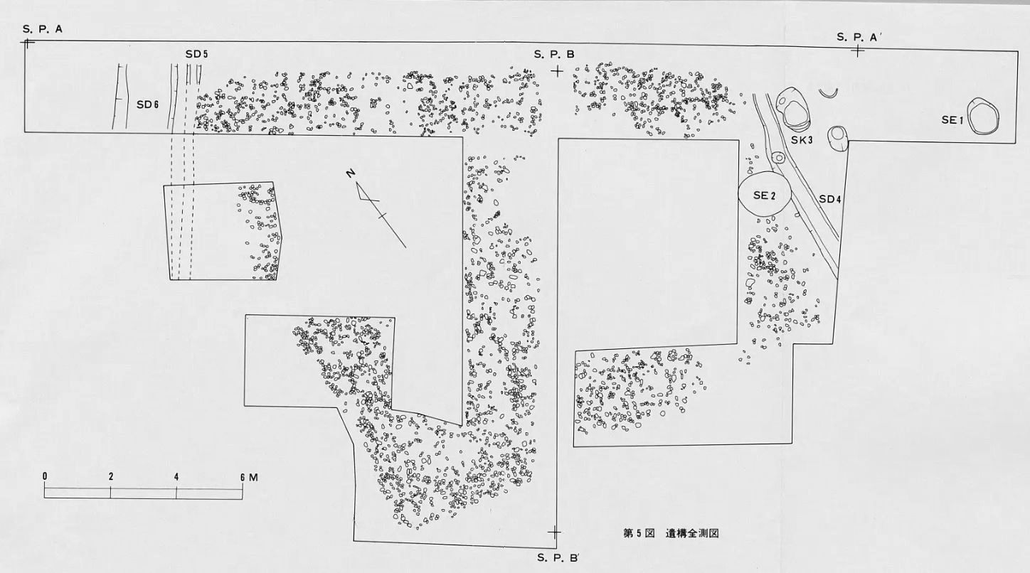 集石は土中の反応から推定されるものも含めて範囲が南北約6m、東西約79mと横長の「建物跡A」と、南側約60mの地点に南北約23m、東西約30mの「建物跡B」の範囲が判明している。