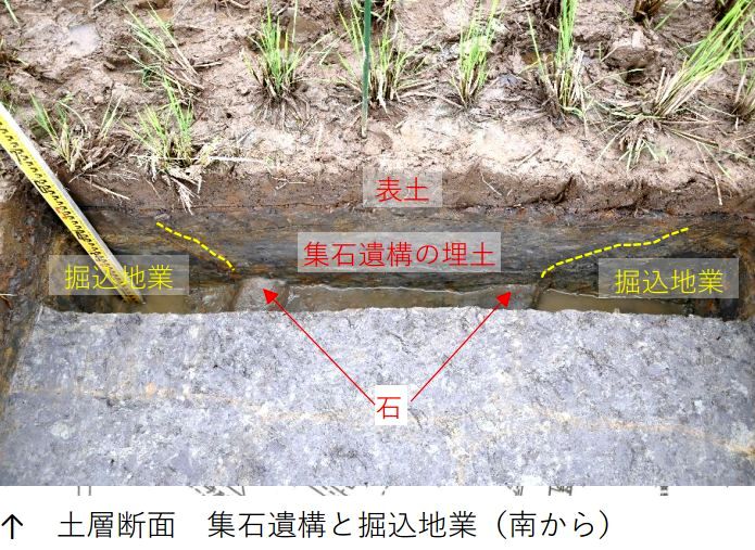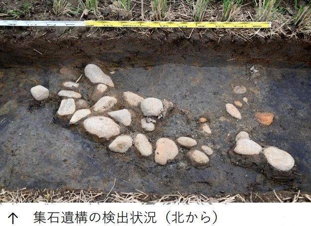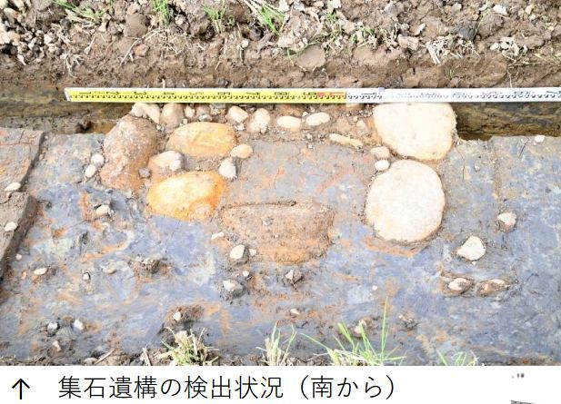 以前は畑だった高まりやレーダー探査の結果を基に調査した結果、石が密集する「集石遺構」が一定の間隔で出土した。
