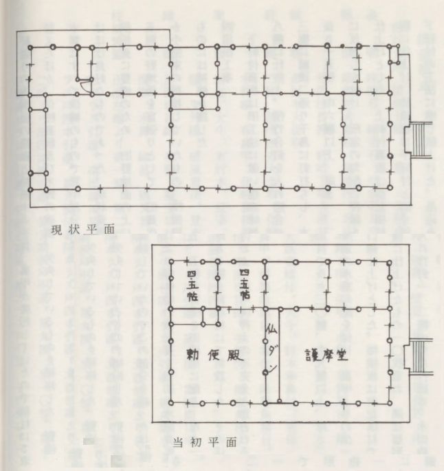 造営記録の桁行7間、梁間4間半、屋根木賊葺きとあり現在の旧部材の平面と一致する。 護摩堂現状・当初平面図