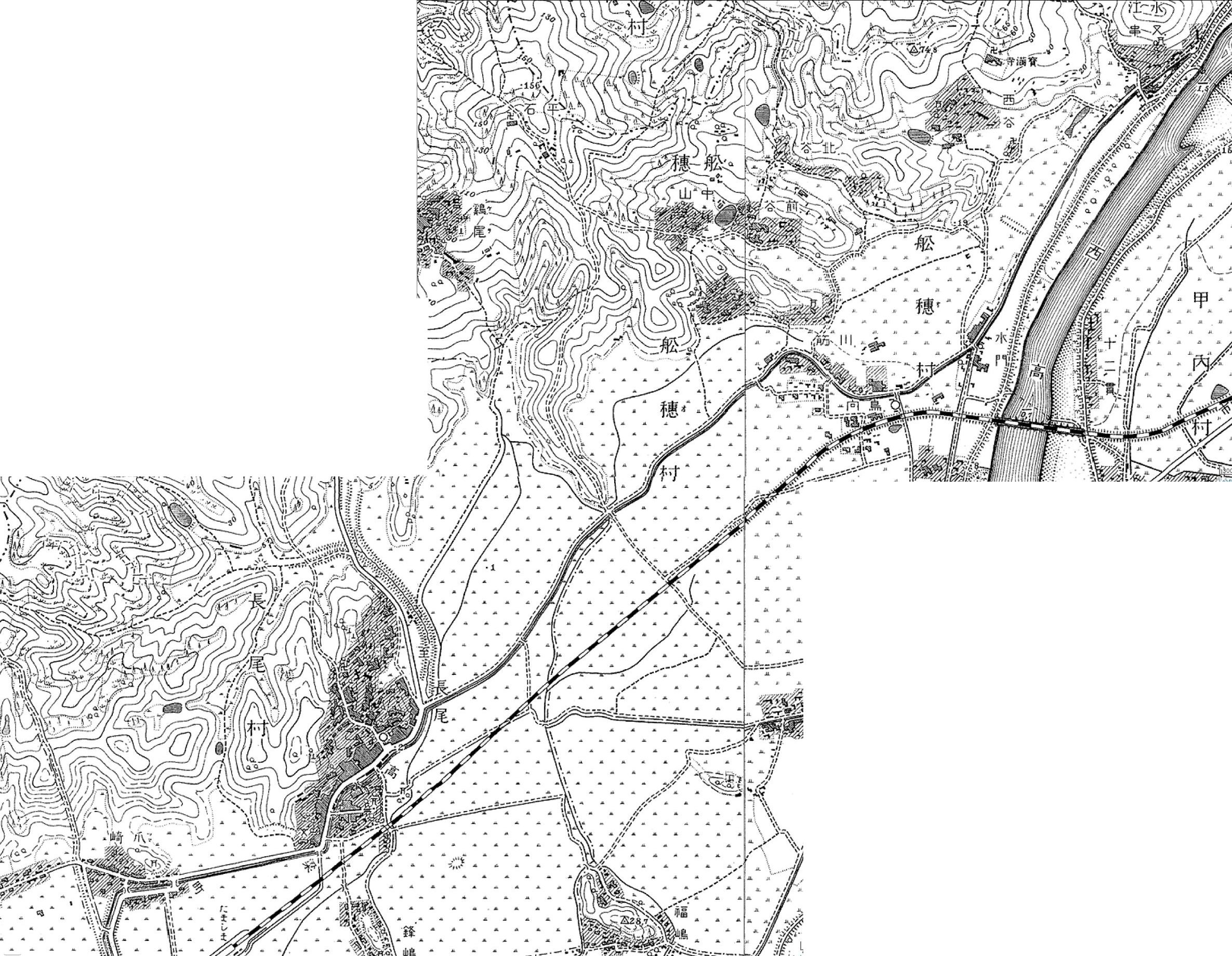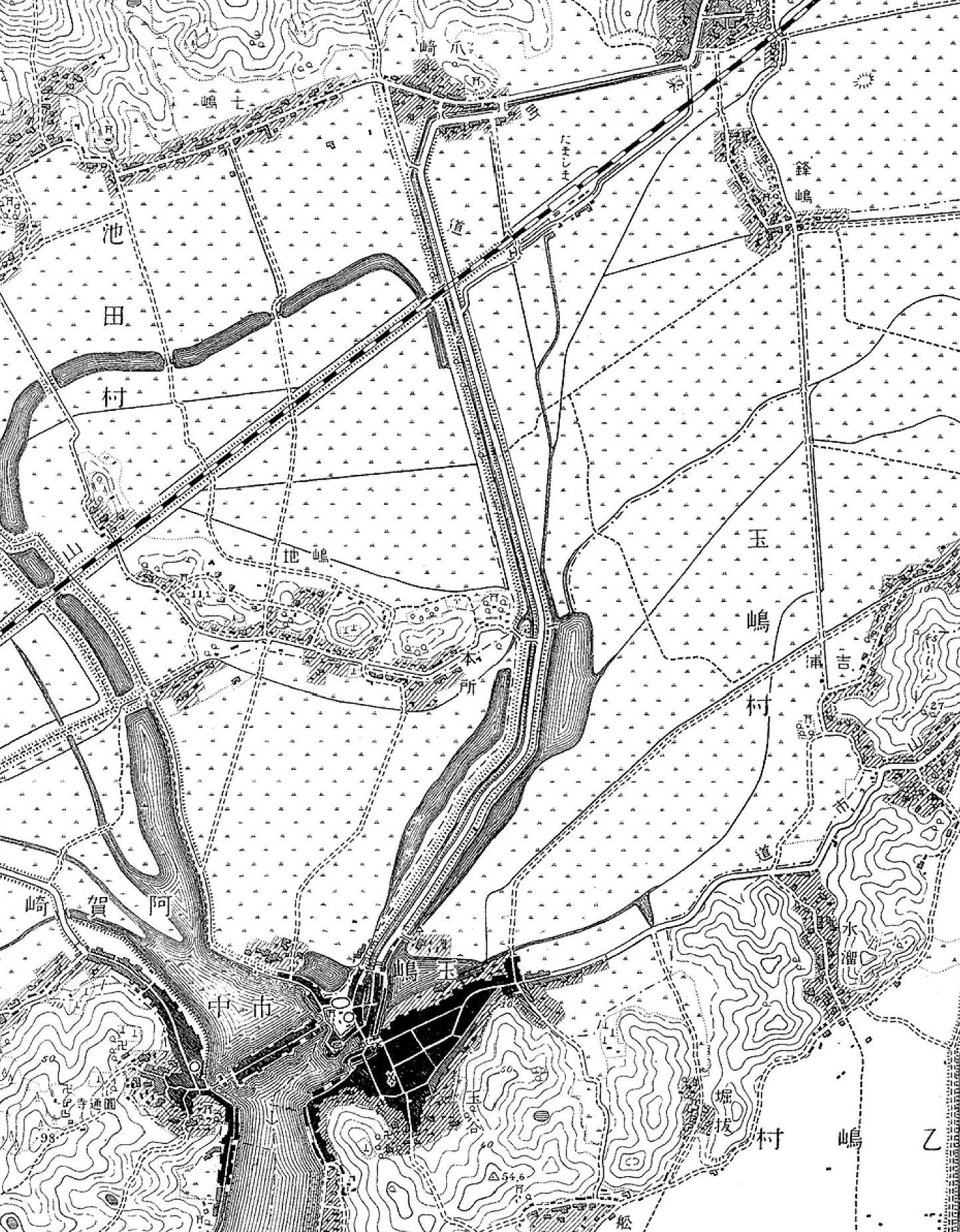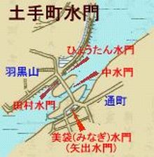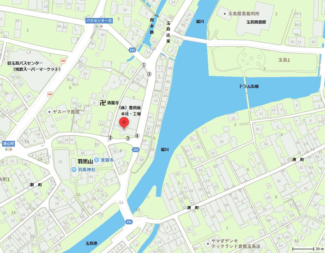 2025/12/18追加: ◇高瀬通し舟溜まり跡 ○サイト:倉敷市 > 文化・観光・スポーツ > 観光・魅力発信 > 観光情報 > みなと玉島空間 > 玉島ぶらっと > 玉島の史跡紹介 > 玉島の史跡紹介 常盤町・栄町・新地町(羽黒神社周辺) では次のようにいう。 「所在:玉島中央町1丁目7ー10(新地町・豊島屋南)」 (※)玉島中央町1丁目7ー10(豊島屋南)とは「高瀬通し舟だまり跡」の説明板設置場所の住所である。 「松山藩水谷候が玉島阿賀崎新田を開拓した万治寛文延宝にかけての約330年前、高梁川の水を入れた灌漑、水運両用の高瀬通しが船穂町水江の堅盤谷(カキワダニ)から糸崎七島を経て、玉島舟だまりまで91粁巾37米ー8.5米で開通された。 (中略) 荷を積み下ろす舟だまりは、羽黒山東側のこのあたり(※)約10アール(※)の水域であった。 羽黒山北側に延びる水路は、新町裏側に通じ阿弥陀水門から舟は港に出た。 明治になってからは、港町に地下トンネルが出来、舟はそこから港に出た。 昭和になって、高瀬通しはその機能を失い道路となり、家並みが建ち現代に至った。」 (※)「羽黒山東側のこのあたり」とは、「高瀬通し舟だまり跡」の説明板設置場所付近をいう。 (※)「10アール」とは1000uで、尺貫法でいえば約1反、坪でいえば約300坪である。 以上など参考に「高瀬通し舟だまり」の跡を探りと次のような結論となる。 推定玉島高瀬通し舟だまり跡:Yahoo地図 より 推定舟だまりは中央の(株)豊島屋本社・工場のある敷地を中心に、地図上に表示した@ABCDで囲まれた船底形の区画が「高瀬通し舟だまり」と推定される。 1)Bは「高瀬通し舟だまり跡」の説明板が設置されている場所である。 2)卍青瀧寺と表示している場所は明治の神仏分離の処置で羽黒山から下山し、新たに造られた新「清瀧寺」のある場所である。 (現在では、清瀧寺は再び羽黒山上に復帰している) 3)高瀬通しは玉島往来に沿って西側に掘削されていたが、この付近では埋めてられ道路の一部に転用されているようである。 地図上、玉島往来の西側に「用水路」(水路)が描かれ、現地で見ると、石垣で築かれ「高瀬通し」の遺構のようにも見える。 しかし、この「用水路」は高瀬通しではなく、「江戸末期の玉島港町分割支配略図」」などに見られるように 「本所悪水川」の名残りであり、「高瀬通し」の遺構ではない。 4)「本所悪水川」は水門を経て、玉島往来の下を暗渠で「溜川」と繋がる。 また、「溜川」は水門を経て、玉島港と繋がる。 ◇近世玉島の成立と干拓、玉島港の繁栄 ○「岡山の港」岡山文庫65、巌津政右衛門、日本文教出版、昭和50年 より 古代から中世の瀬戸内航路は児嶋の北側を通るものであった(児嶋は当時は嶋であった)。そして西行きの船は児嶋の北を通り連島の北を通り、さらに船は乙島と柏島の間を南下し、水島灘に出るものであった。(連島・乙島・柏島も往時は嶋であった)。 中世末期には藤戸海峡(児嶋の北)は通船不能となり、児嶋の南が瀬戸内航路となる。 寛永6年(1629)連島の北面新田と西阿知の河内新田が開発され、連島は陸続きとなり、東高梁川の流路が決まる。 寛永元年から正保元年(1645)の間に長尾新田・船穂新田が完成し、萬治2年(1659)爪埼・上成・古水門までの干拓が完成し乙島が陸続きとなる。つまり西高梁川の流路が決まる。 さらに寛文4年(1664)水谷氏は矢出から羽黒山の達する新堤と羽黒山から糸崎橋(※)までの堤防を築き、諸所に水門を設ける。 (※)糸崎とはよく分からないが、これは、あるいは「爪崎」の誤植であるかも知れない。 これにより、現在の通町・本町・団平町・矢出町・中島などの開発が進む。 寛文8年(1668)西高梁川右岸を検地し玉島村と命名、上成と爪崎を玉島村の枝村とする。 寛文11年水谷勝宗、阿賀崎新田を完成させ、同時に玉島西部に港を作る。この玉島港は旧乙島と旧柏島に挟まれた南北の長い港であり、現在もこの形を引き継ぐ。 阿賀崎新田の築堤は長さ約400m、幅約50mで、築堤上には港問屋の屋敷割がなされ、海岸沿いにはナマコ壁の倉庫が並ぶ景観となる。この問屋街は後に新町と呼ばれ、問屋ははじめ10軒であったが元禄年中には43軒を数える。 さらに港湾の浚渫を行い、千石船の接岸及び出入りが可能となる工事も実施する。 また萬治2年水谷勝宗は浅口郡水江(船穂水江)に堰堤を築き、水門・閘門を設け、船穂・長尾を経て玉島に至る延長約10kmの新川を掘り、高梁川を往来する高瀬舟を新川に導入する。 新川は「高瀬通し」と称し、新地町の南端から暗渠で連絡が可能であった。 高瀬舟は松山藩の蔵米を、また備中奥地の物産を玉島に運び、帰り荷には塩や肥料を積んで帰った。 まさに玉島は松山藩の外港の役割を果たす。 玉島港には阿波の藍問屋の船がよく入港し、近畿・九州方面の船も入港した。 江戸中期には日本海を西下し、関門海峡を通る北前船の入港が盛になる。 北前船はニシンの〆粕(しめかす)を主とし、これは玉島付近の主生産物であった綿の栽培に必要な肥料であった。玉島港