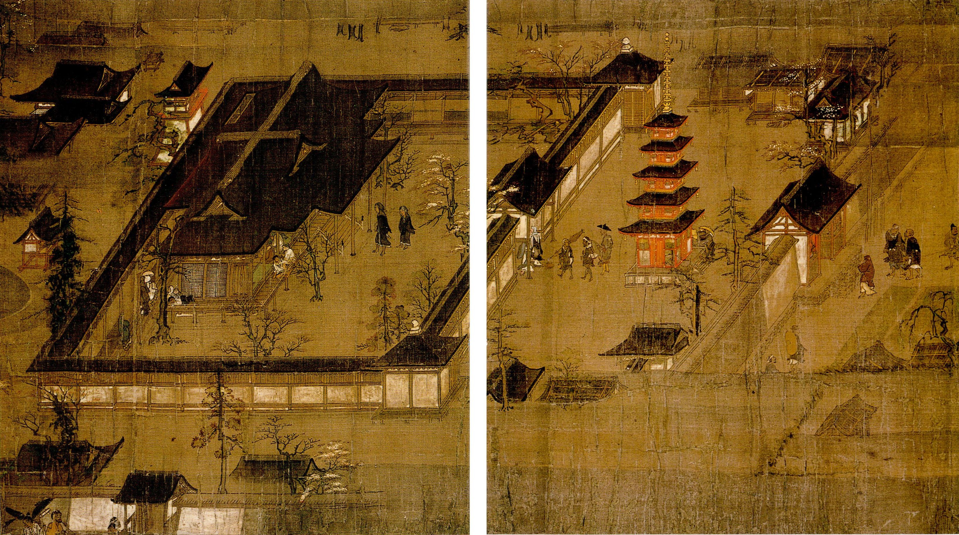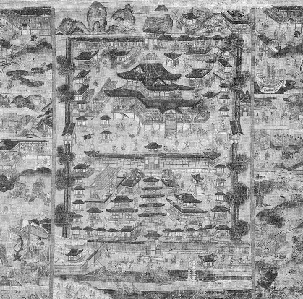 左端中央付近に三重塔が描かれる。中世には三重塔があったものと推定される。