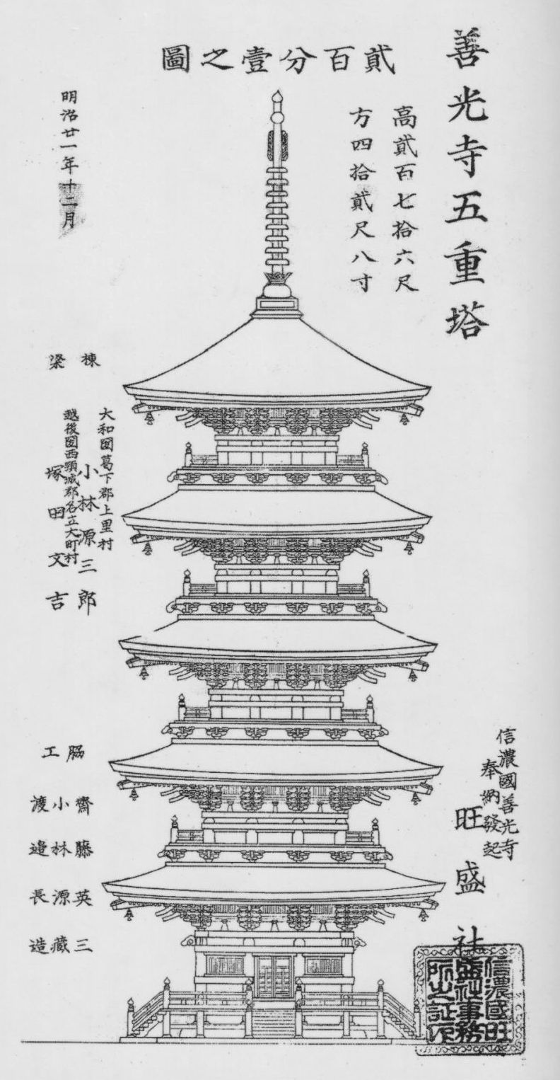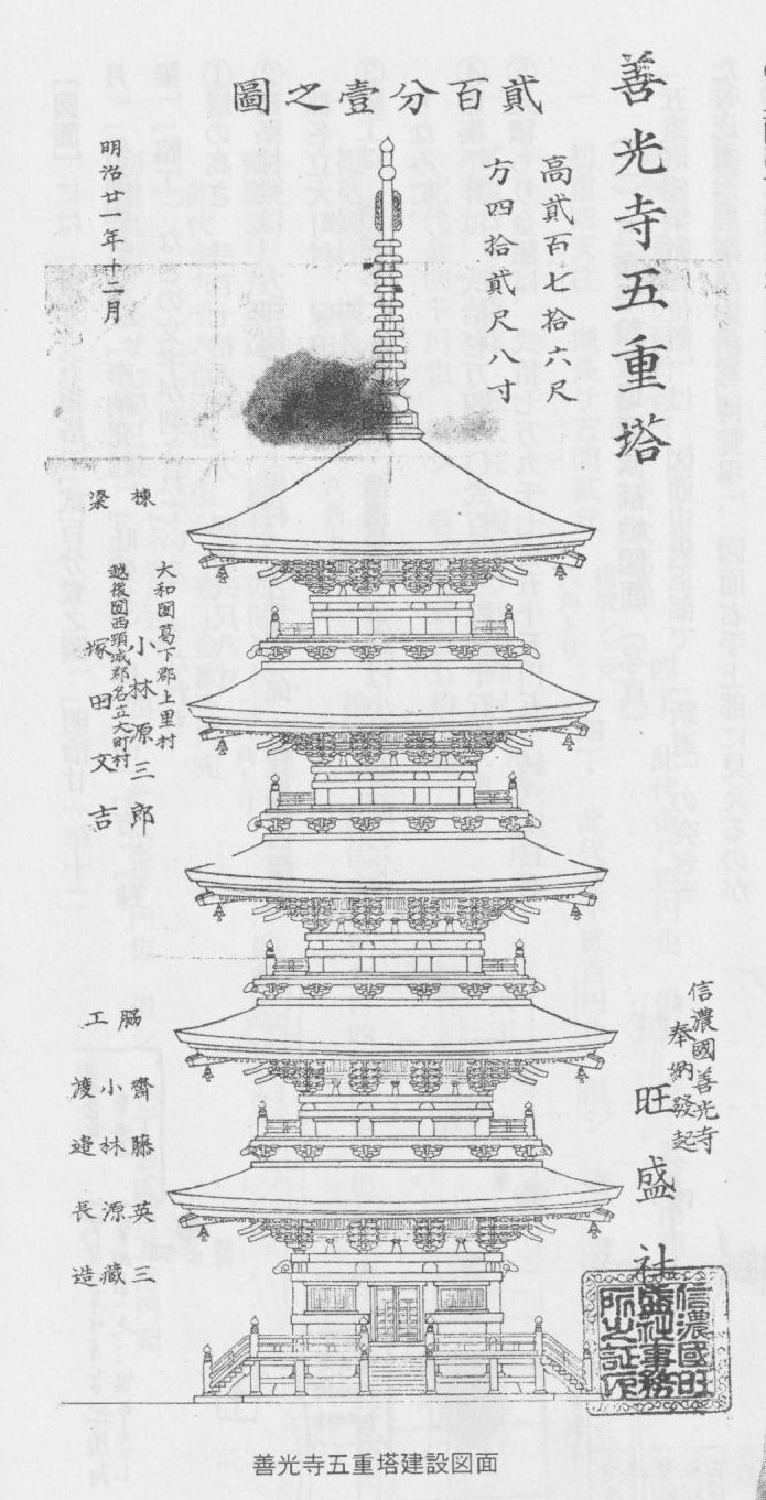 ○「長野市誌 第2巻 歴史編 原始・古代・中世」長野市誌編さん委員会、長野市、2000.1 より 具体的に善光寺五重塔の姿が分かる現存する最古の絵図であろう。 ※本図は下に掲載している。