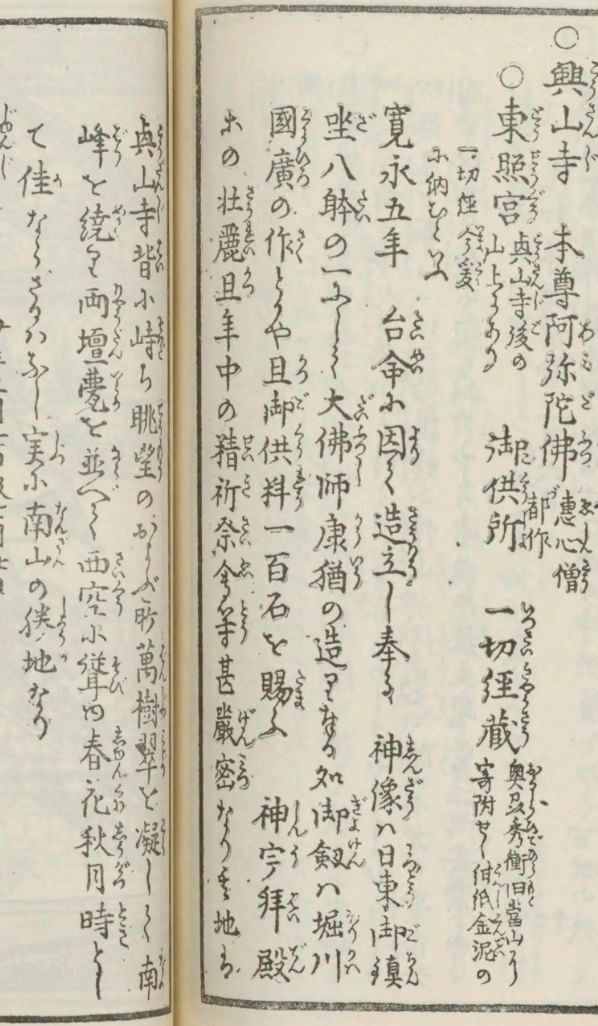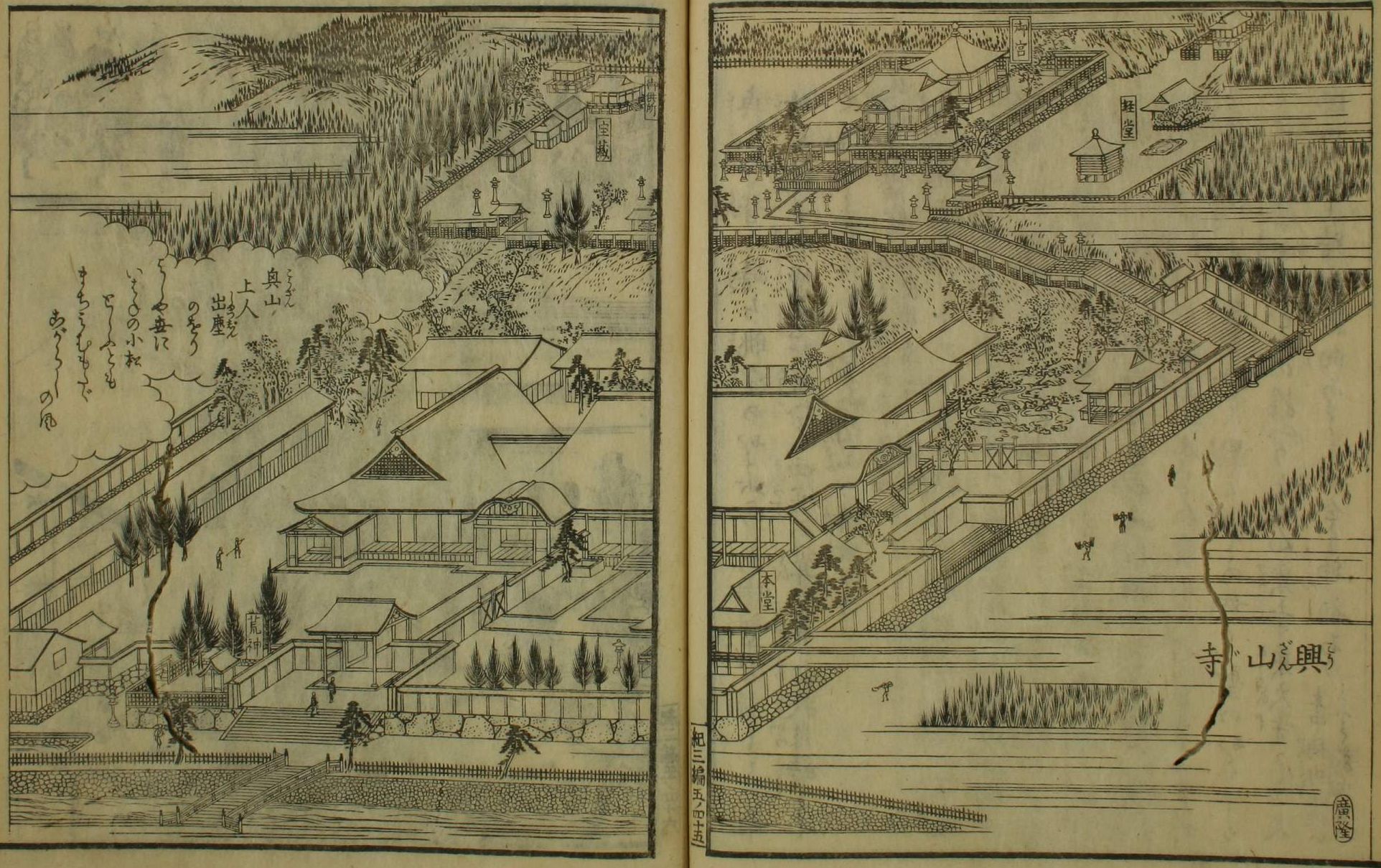 なお、本図の高祖院多宝塔の左には大徳院東照宮家康廟/薬師堂・秀忠廟/位牌堂)と中央右には興山寺東照宮が描かれる。