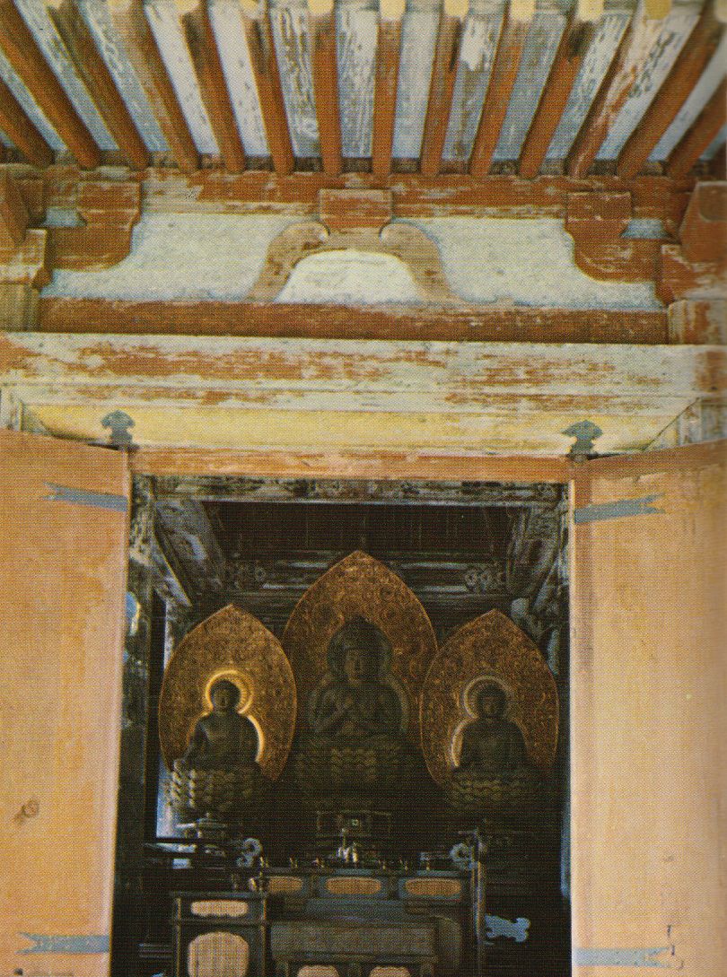 背面側は中央間を内陣とし、脇間は前後に間仕切り小部屋を設ける。柱は角柱、組物は正背面を除き舟肘木とする。