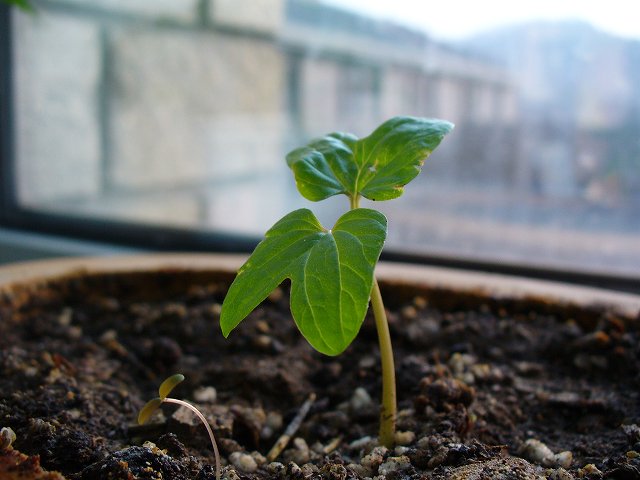 窓際に置いた鉢植えから芽が出て、毎日すくすく育っている。がんばれ新芽!