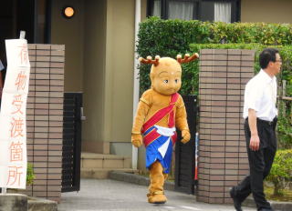 ふと見ると正門前の建物から、奈良県の誇るゆるキャラ(緩いか?)、せんと君が出てきました。いやあ、い
