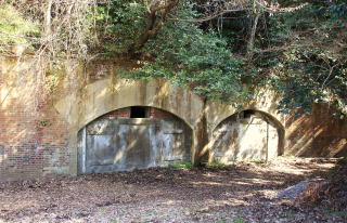 広場の奥には石垣で補強した切り通しがあり、その先には赤レンガ造りの掩蔽が2つ並んでいました。上