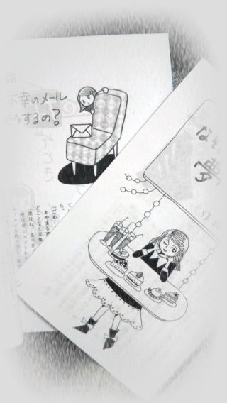 『ゆめぐるま』の物語は、6年ほど前に、同人誌に短編を連載したことから始まりました。(同人誌なので、挿絵も自分で描いていて、主人公の詩織ちゃんはドレッシーな服装でしたね) 一番最初に書いたストーリーは、「不幸のメール、どうするの?」という話で、これは『ゆめぐるま』3巻目に収められた「のろわれたイスの秘密」の基になっています。詩織ちゃんの親友・ユッピのところに届いた不幸のメール、落ち込むユッピをどうやって励ますのでしょう? 私が小学校低学年だった頃、当時流行っていた不幸の手紙なるものが来て、「同じ文面で誰かに出さないと不幸になる」と、真剣に怖くなったのを覚えています。結局、父親が「宛先を交番」にして出してくれました。「困りごとは、おまわりさんへ」ですね。もちろん、そこでストップさせてくれますからね。