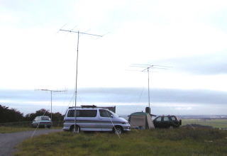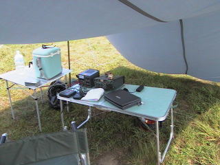 移動シャックのようす 移動アンテナ奥が私の50MHz6エレ八木・手前がローカル運用28MHz3エレ八木