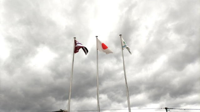試合スナップ 曇天の下翻る日の丸と協会旗