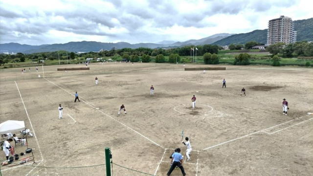 前日設営の日は、午後から局地的豪雨になり外野フェンスも支柱を打ち込むことしかできず、翌初日に1時間早く集合し、急ピッチで会場設営にあたりました。