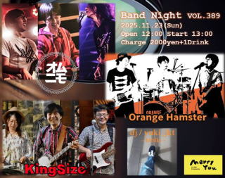 KingSize × OMNIMO × Orange Hamster @Merry You「BAND NIGHT」 とき/2025年11月23日(日) 開場12:00 開演13:00 ところ/Merry You 料金/¥2,000+1オーダー 出演/KingSize、オムニモ、Orange Hamster オリジナルバンドが3組。ここでしか聴けない音楽をお届けします。 |