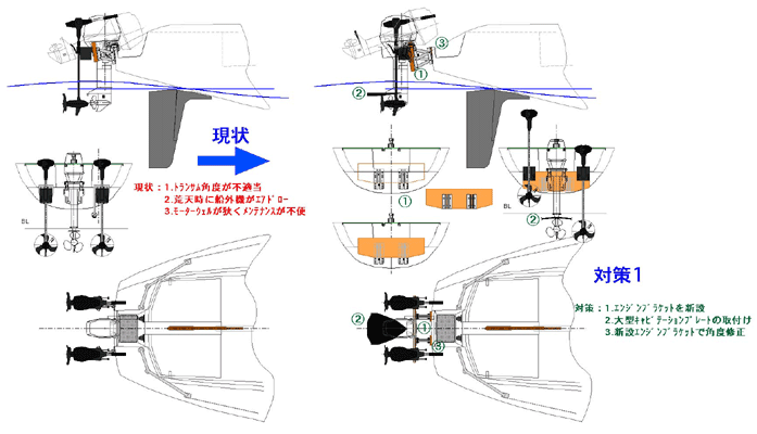 ●Y-26Sのトランサム角度は浅くチルトピンを使えない状態なのでエンジンブラケットを