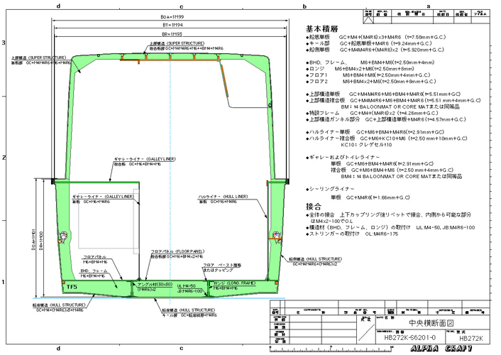 掲載する資料は不鮮明なのでハウスボート販売や製造を検討する造船所や企業には一定の契約書あるいは誓約書を交わした後に印刷した資料を一式提供します。 検討済資料リスト 企画(はじめに) ハウスボートのブランド所有権 一般配置図 必要馬力曲線 適正機関出力検討 ハル、デッキ、ライナーラインズ 型割り(各モデル共通型) 排水量等曲線 パーツリスト(非配付) 横安定に付いて(GM値) 復元力曲線(GZcurve) DC12V,24V電源系統図 ハイブリッドシステム シンプルハイブリッドシステム 燃料系統図 諸管系統図 ガラス板厚検討 HB272K-SKセクション一覧図 室内配置図 中央横断面図 室内艤装図(準備中) HB272K船体構造図1(ロンジ、フレーム) HB272K船体構造図2(フロア) HB272Kハル補強材一覧図1(フレーム) デッキ構造図 ハルライナー部品図(例) ビルジ経路図 ハル、デッキカップリング 機関艤装図(準備中) 浮き姿検討(準備中)