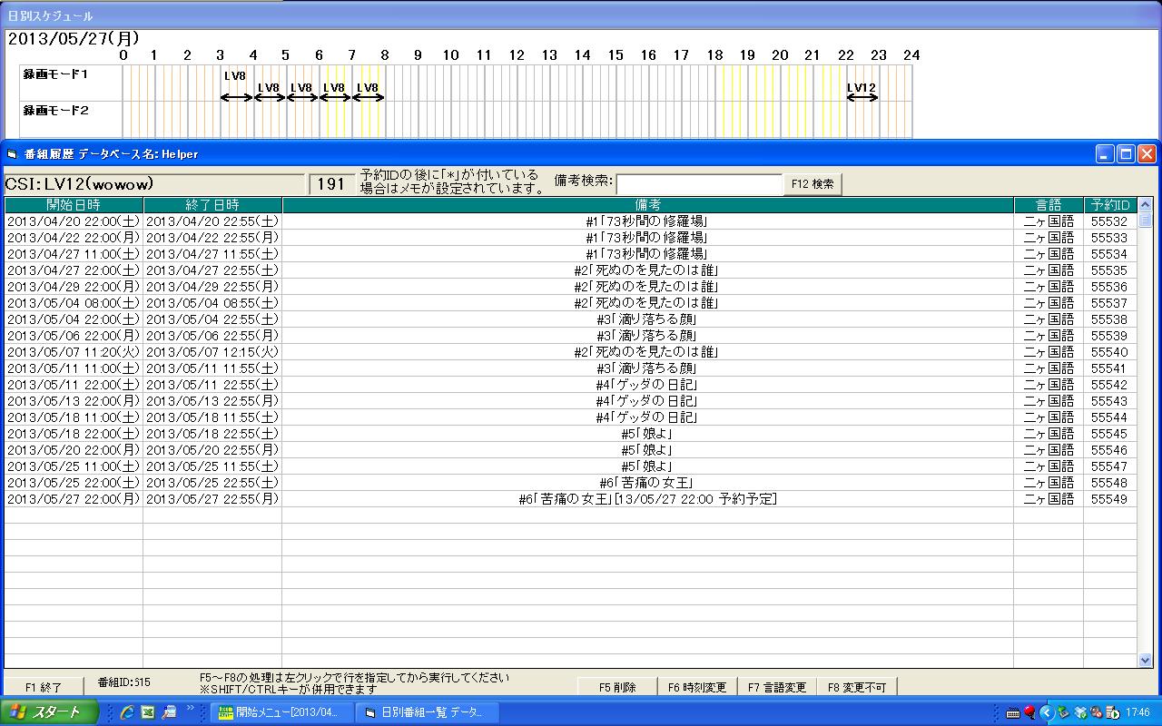 まず上の画面(27日)のCSI:LV12の行を右クリックしてメニューから[予約予定]をクリックすると備考に放送日時と予約予定の文字が追加されます。