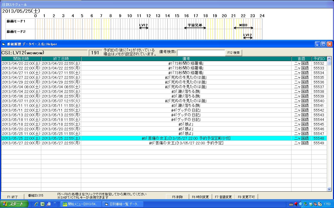 ここでファンクションキーの上の数字をクリックして25日の放送スケジュール画面を表示させ、CSI:LV12の行を右クリックして[実行切]か[削除]してしまうのが一番簡単なのですが、多少面倒でも次の方法をお勧めします。