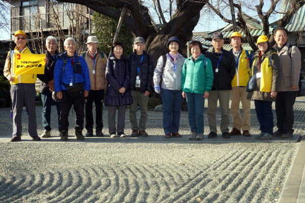 | 2019年(平成30年)1月5日(土曜日) 2019年は元旦から青空が続いています。今日も朝から雲ひとつない晴天に恵まれました。幸い風がなく気温も上がり、穏やかなガイドウォーキング日和となりました。新年最初のガイドウォーキングは、新春恒例の瀬谷八福神めぐりです。午前半日のご参加者を含めて30人の方々にご参加頂きました。 瀬谷八福神めぐりコース概要: 瀬谷駅北口(午前9時集合)→①長天寺→②妙光寺→③善昌寺→④徳善寺(半日)→⑤寶蔵寺→⑥西福寺→⑦宗川寺→⑧全通院勢至堂(午後1時50分終了。現地解散)。 |
