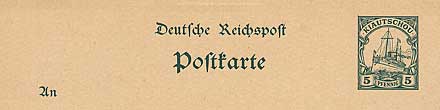 1914年に膠州湾のすべてのドイツ郵便局が閉鎖された後も、新しい形式の葉書が準備され、不発行となった葉書が4種類あります。1914年から1917年の間に作られ、敗戦後にベルリンの郵趣家窓口から収集家向けに販売されました。戦時中の物資不足のため、粗悪な用紙に印刷されています。 ドイツ植民地の先頭のページに戻ります。 |