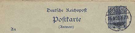 1900年から、それまでの数字・鷲図案切手からゲルマニア図案切手に変わったのに伴い、葉書も図案が変更されました。市内用2ペニヒ葉書と往復葉書、市外用5ペニヒ往復葉書、外信用10ペニヒ葉書と往復葉書があります。このシリーズに市外用5ペニヒ葉書が入っていないのは、1899年12月26日に1900年記念葉書が発行されていて、その在庫が大量に残っていたためで、登場は次のシリーズになります。 印面の下の部分にREICHSPOST(ライヒス・ポスト)という文字が入っていることに注意してください。同じ図案で、印面の下の部分にDEUTSCHES REICHと入った別のシリーズがあります。 市内用2ペニヒ葉書と往復葉書の用紙には、灰色と青色の色違いがあります。灰色とは言っても、青みがかったもので、完全な灰色ではありません。 このシリーズが、製造年月が入った最後のシリーズとなりました。 市内用2ペニヒ往復葉書と市外用5ペニヒ往復葉書の往信部は、葉書の左下の「Die angebogene Karte ist für die Antwort bestimmt.」の4行の表示で区別します。葉書の上半分を見ても、普通の葉書とは全く区別が付きません。下の写真は、市内用2ペニヒ往復葉書の往信部の表示です。市外用5ペニヒ葉書も同じ位置にあります。