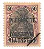 切手に「PLÉBISCITE」(住民投票)、「OLSZTYN」、「ALLENSTEIN」の文字を加刷したシリーズです。ポーランド系住民がごく少数であったため、彼らの感情への配慮から、ポーランド語の表記である「OLSZTYN」がドイツ語の表記である「ALLENSTEIN」よりも上に配置されています。この方が、文字数のバランスから見ても安定しているので、よい決定であったと思います。