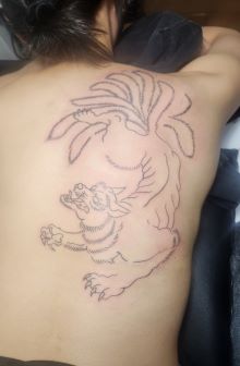 前回は、腕に「狼」のリアル仕上げを入れました。 今回は、背中にドーンと「九尾の狐」を希望です。 今日は、筋彫りが終わりました。 次回は、墨ぼかしの予定です。 「九尾の狐とは、中国に伝わる伝説上霊獣で、知恵や 変身能力を象徴するもの、天界から遣わされた、神聖な 獣として崇められる」 |