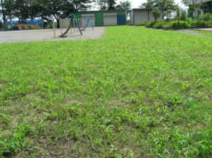 実際に芝生を植えたのは、校庭と校舎の間の一部だけで、プールの2倍弱の広さでしょうか、現地を見てみると、いかにも狭いなあという感じでした。