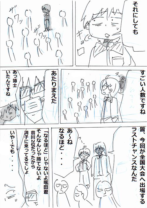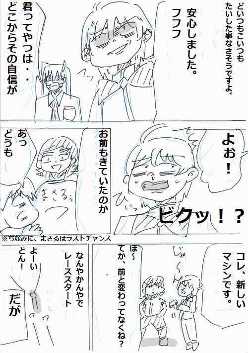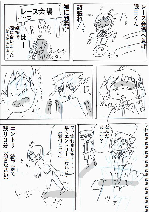 ・新マシンが完成したので、レース会場へ急いで向かう眠田くん。