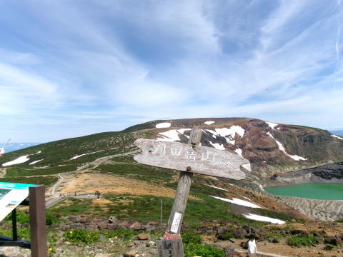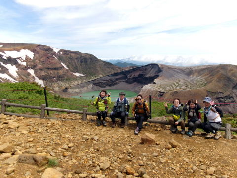 | いつもそうであるが、阪神タイガースの応援遠征と合わせて、山も計画している。今回は楽天イーグルスとの交流戦で仙台に行った。2人は2日間野球観戦、5人が合流して7人のメンバーで蔵王山、金華山の2座を登ってきた。 2025.6.16 1日目 レンタカー1台で7人乗車して宮城県側の刈田岳の駐車場を目指す。前回1人で来たときは、山形県側からロープウェイを使い、蔵王温泉から縦走したが、今回は刈田岳からの入山としていた。 刈田岳は駐車場から数分で行くことができる。観光客も多い。眼下にエメラルドグリーンのお釜が見えている。 |